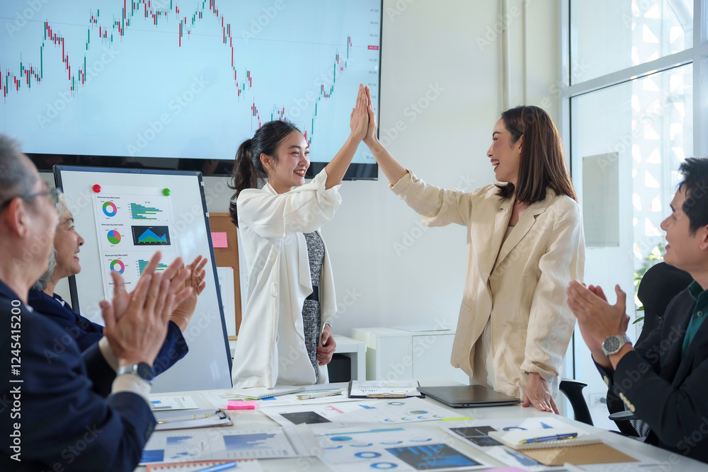 Businesswomen high fiving celebrating success with team clapping in office meeting