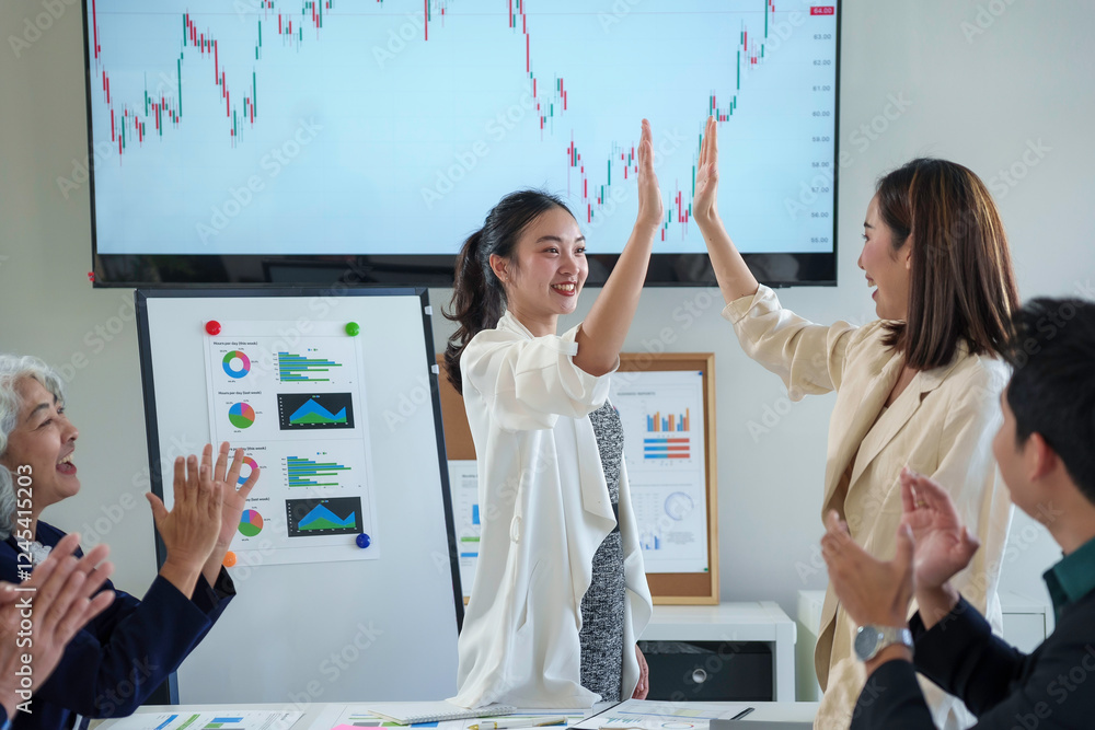 Businesswomen high fiving celebrating successful investment strategy in meeting room