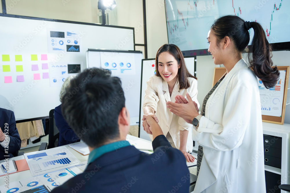 Businesswomen shaking hands during a meeting with colleagues applauding