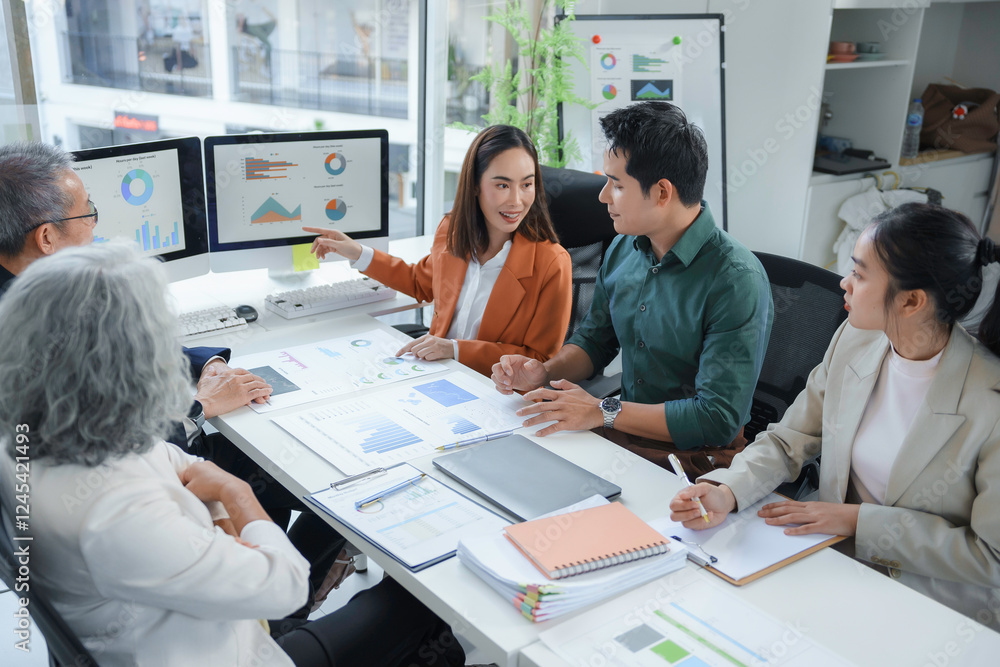 Business team analyzing financial charts and graphs on computer and paperwork during a meeting