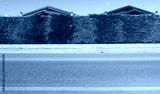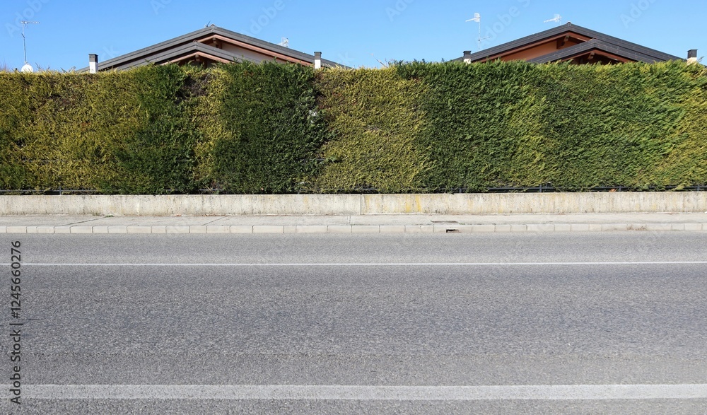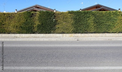 Fence consisting of a concrete base with a high hedge. Cement sidewalk and street in front, rooftop and sky on behind. Background for copy space.