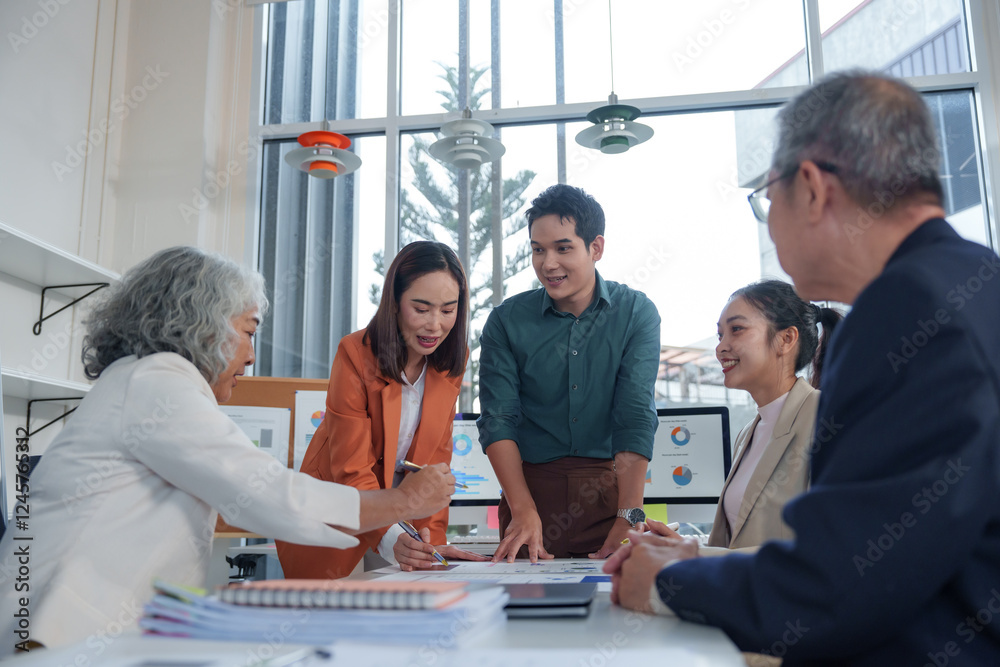 Diverse group of business professionals collaborating on project, analyzing charts, and strategizing in a bright, modern office environment