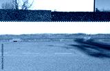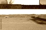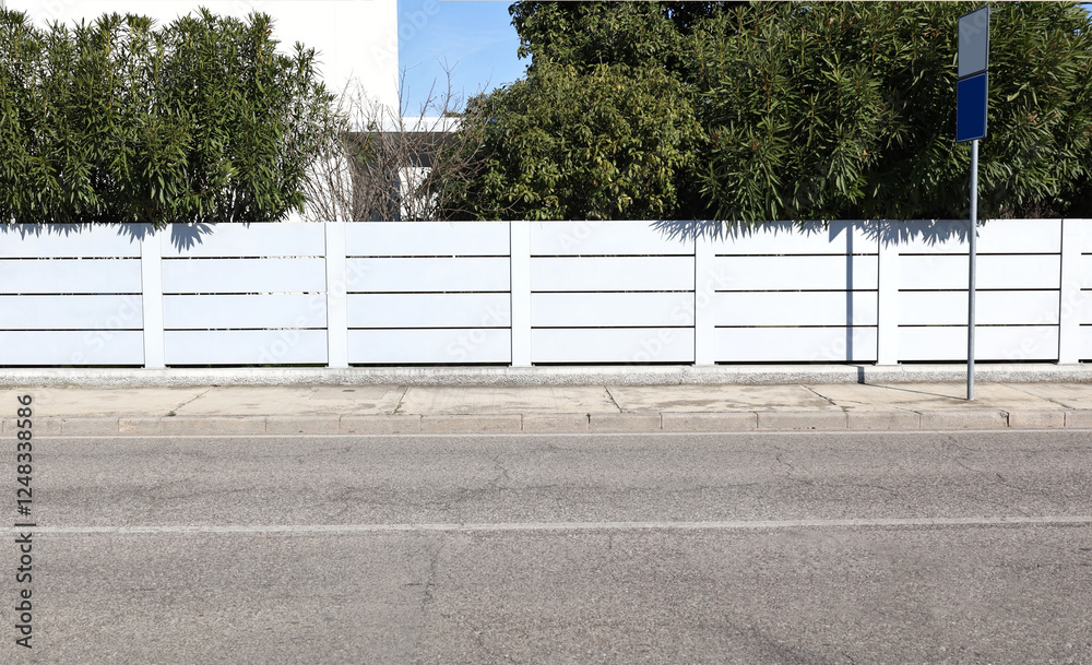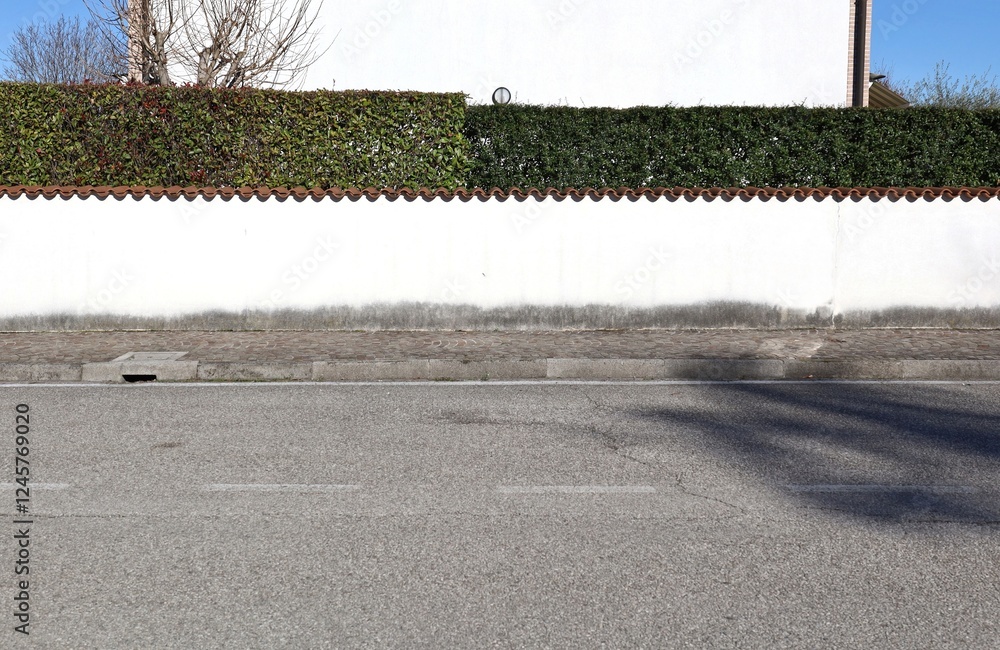 White plaster fence with a row of roof tiles on top. Sidewalk and street in front, white wall and hedge on behind. Background for copy space.
