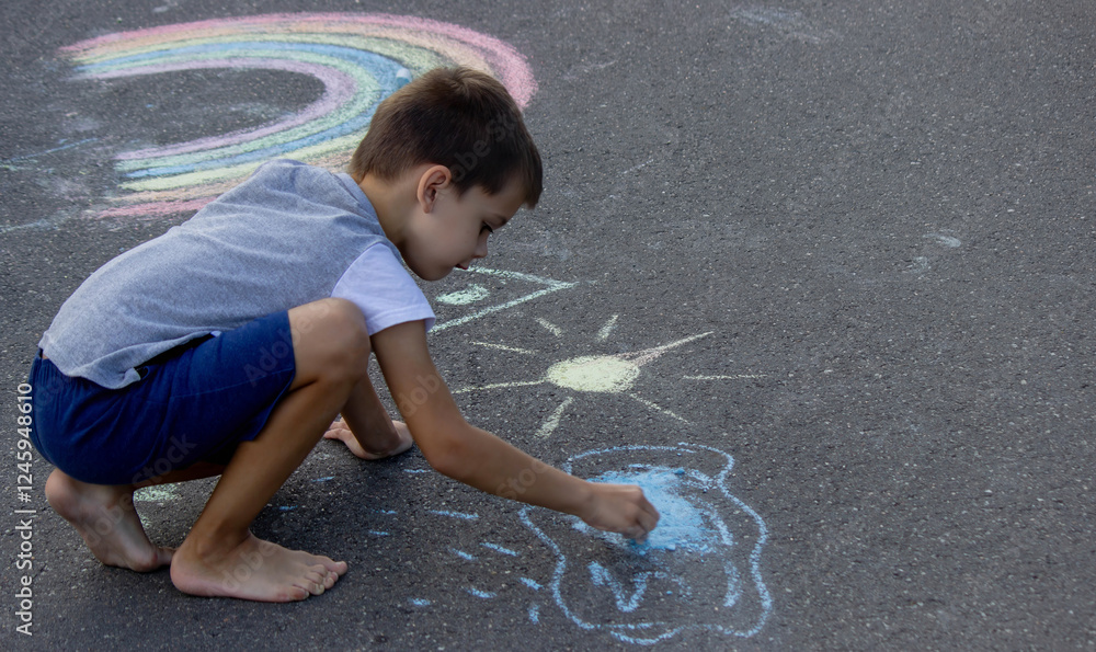 The child draws with chalk on the asphalt. Selective focus. Kid