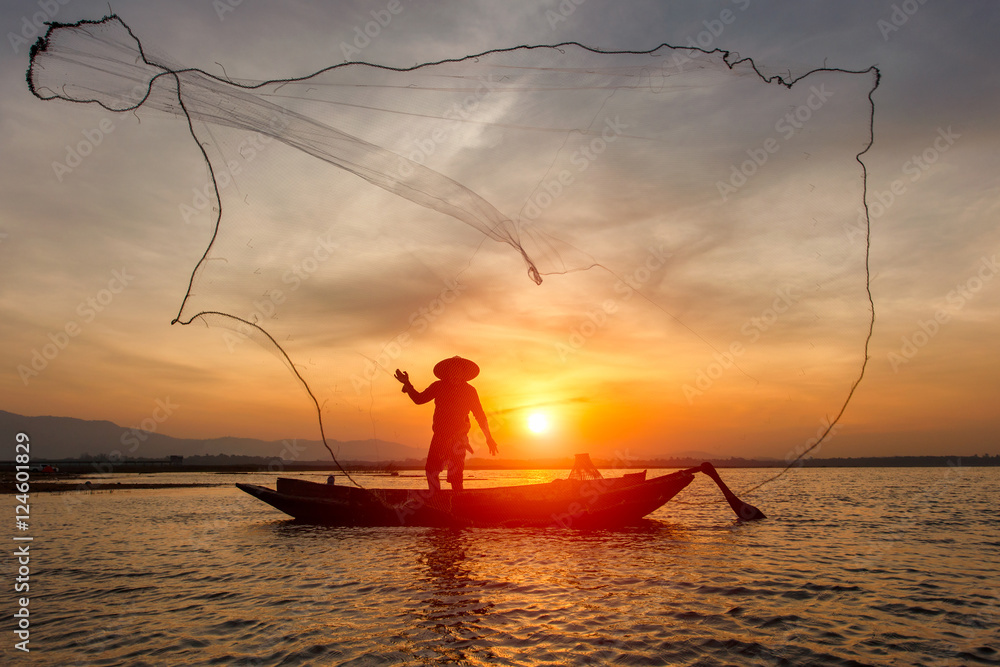 Silhouette of traditional fishermen throwing net fishing inle lake at sunrise time, Myanmar