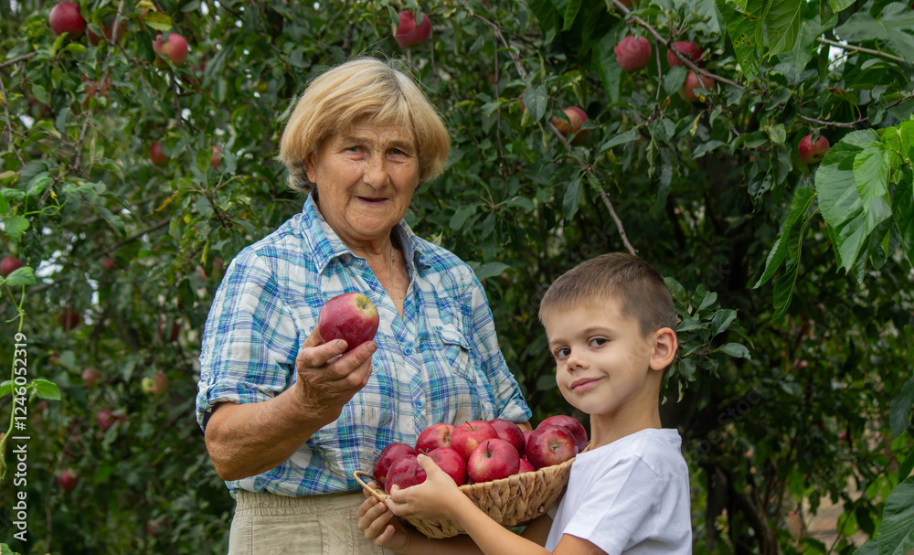 Generations of Harvest Grandmother and Grandson with Fresh Apples