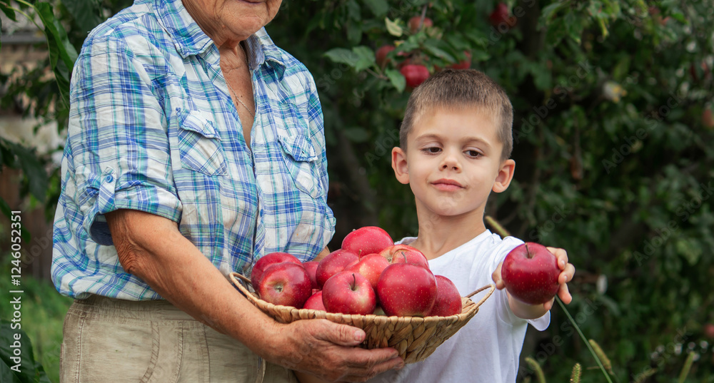 Generations of Harvest Grandmother and Grandson with Fresh Apples