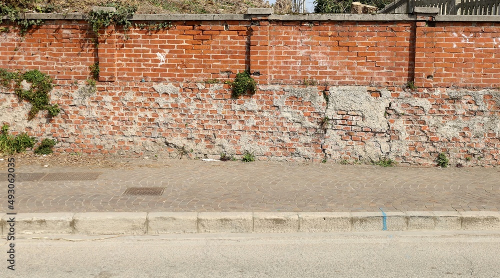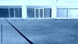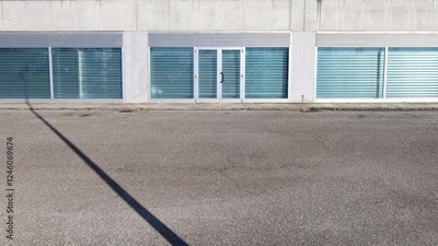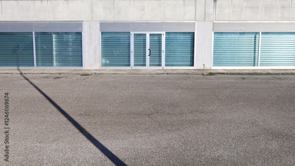 Glass door and windows with interior sunshade shutters in a concrete building at the roadside. Sidewalk and street in front. Background for copy space