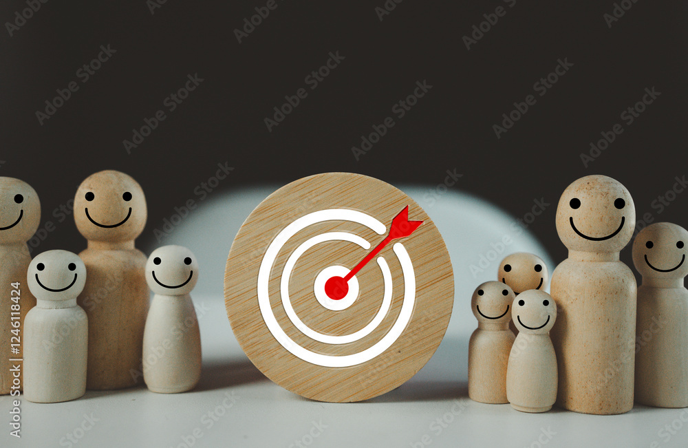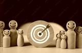 Target dartboard icons on wooden circles with peg doll ready to go achievement goal, clearly shows the goals of the business with working systematically