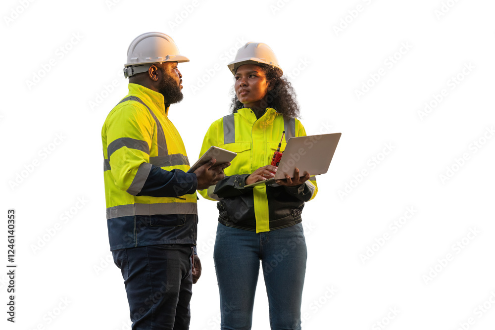 Engineers wearing safety gear, including hard hats examining survey standing industrial facility engaged in a job requires high safety standards concept with PNG white background.