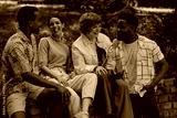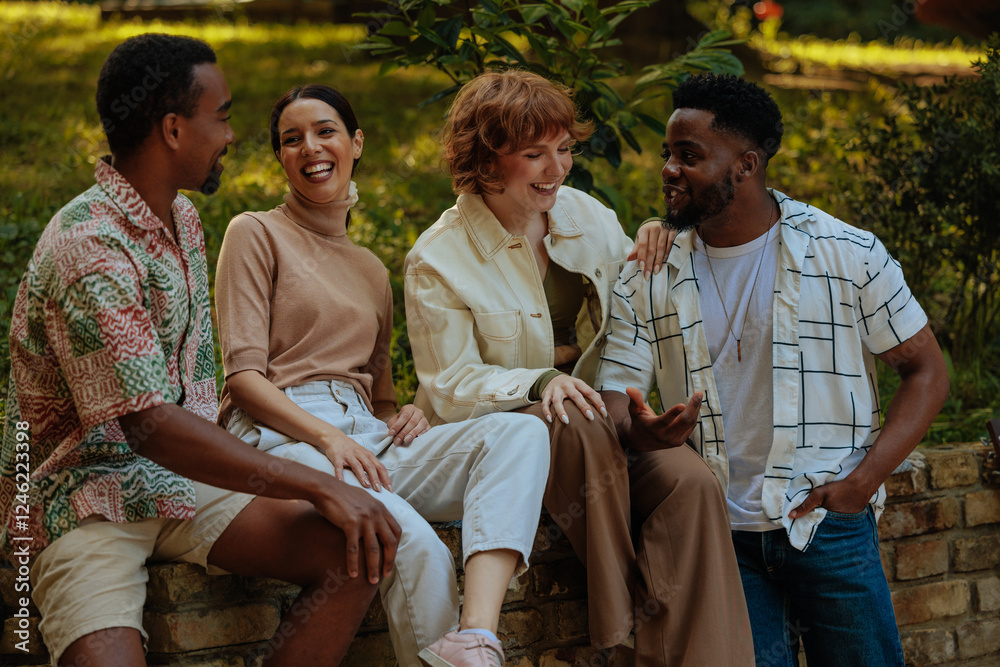 Group of friends sitting on a small brick wall