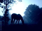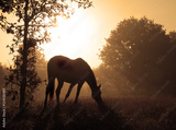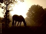 Peaceful image of a grazing horse against sunrise and thick fog in rich sepia tone