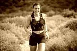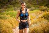 Female trail runner wearing black sportswear and a hydration vest, running through a scenic natural landscape on a rocky path.