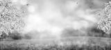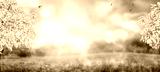 Beautiful apple trees garden blossoming on sunny spring day on natural blurred background