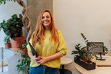 Smiling businesswoman holding tablet, standing in modern office with plants