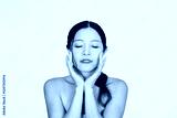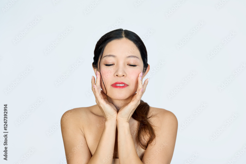 Middle aged Asian woman model touching aging face skin advertising antiage facial skincare beauty treatment and anti age lifting moisturizing salon cosmetics isolated on white background. Close up.