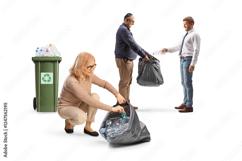 Two men and a woman collecting plastic bottles for recycling
