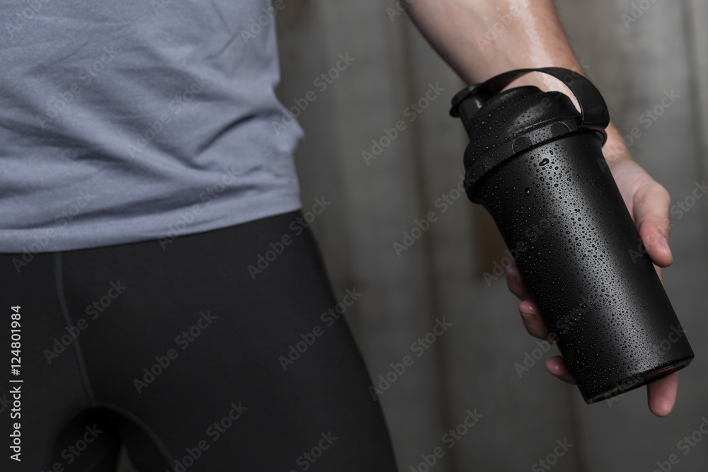 Muscular fitness male bodybuilder holding protein shake bottle r