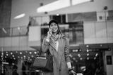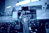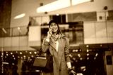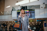 Happy woman communicating on mobile phone at departure terminal at airport.
