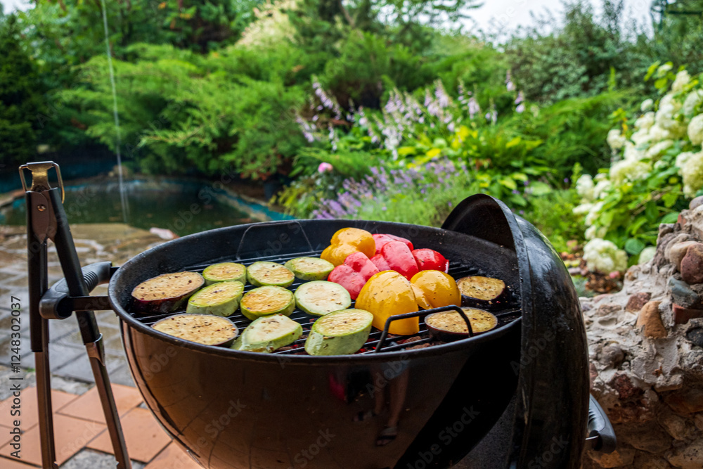 Grilled Vegetables Bring Vibrant Flavors to an Outdoor Gathering Amidst Lush Greenery on a Serene Summer Day