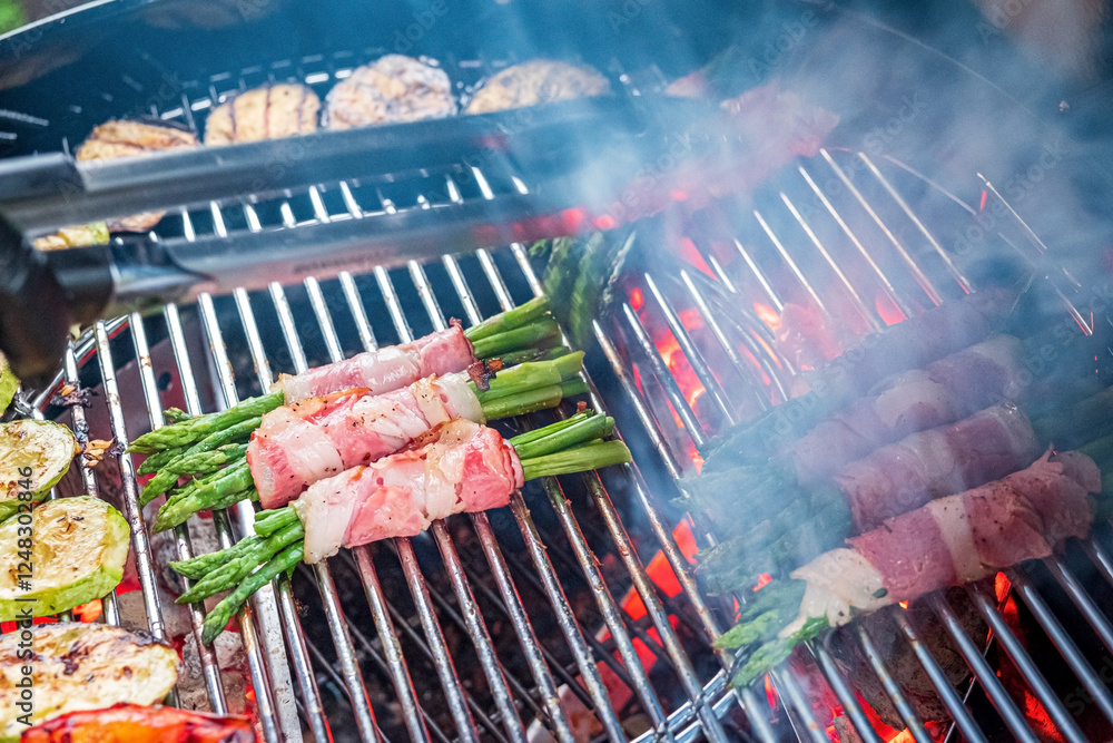 Grilling Asparagus Wrapped in Savory Bacon Alongside Colorful Vegetables on a Smoky Outdoor Barbecue on a Sunny Afternoon