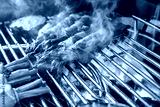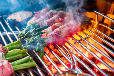 Sizzling Skewers of Bacon-Wrapped Asparagus and Vibrant Vegetables Grilling Over Glowing Embers on a Summer Evening Outdoors