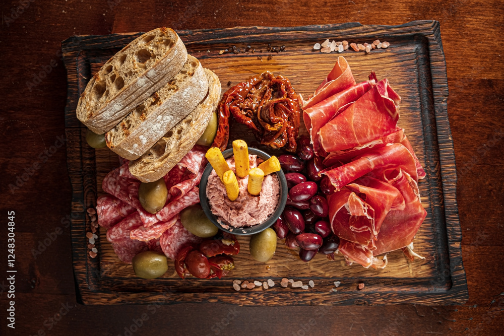 Delicious Charcuterie Board Featuring Cured Meats, Olives, and Artisan Bread Artfully Arranged on Rustic Wooden Platter
