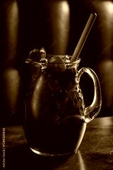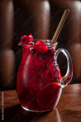 Refreshing Fruity Beverage Served in a Glass Pitcher With Vibrant Red Hues, Garnished With Delicate Rose Petals, Nestled on a Wooden Table in a Cozy Setting