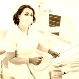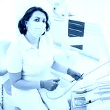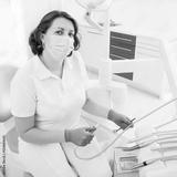 Dentist woman with dark hair in mask sitting on a chair in the dental office.