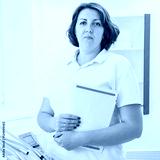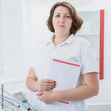 Dentist woman with dark hair standing near a chair in the dental office.Doctor holding papers