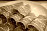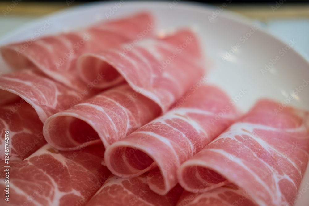 A close up of thinly sliced pork for hotpot, detailed marbling and fat. Pork platter