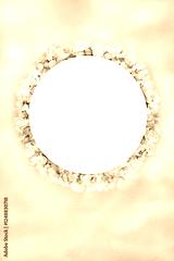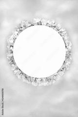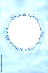 Spring apple blossom wreath Beltane flower wreath farme on sky background copy space. Seasonal nature symbol celebration of renewal of nature.