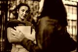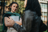 A young woman listens intently to another person during an open-air discussion, expressing emotions.