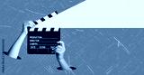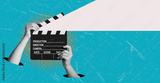 Modern art collage showing hands holding a clapper on a blue background with copy space.