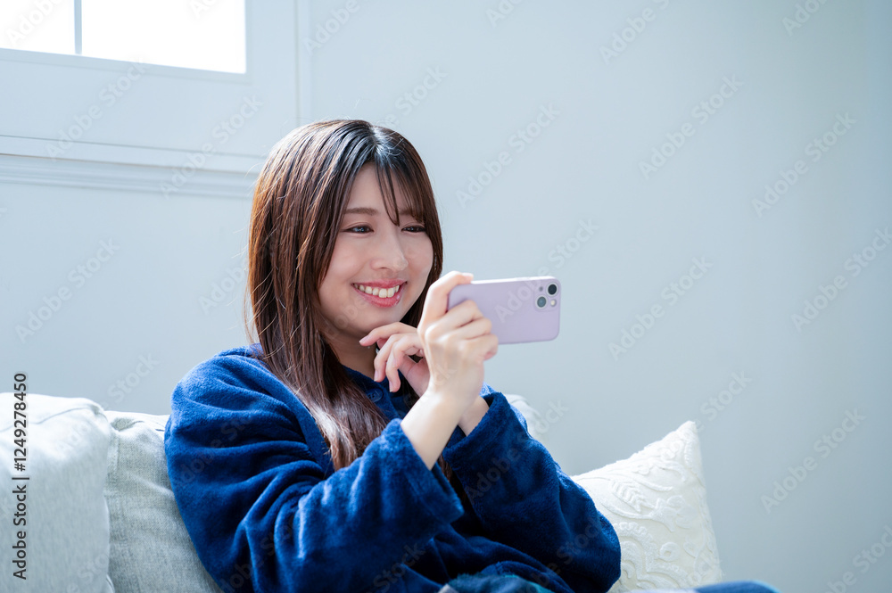 冬のリビングで笑顔でスマホを操作する日本人女性