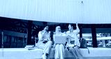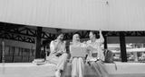 Excited diverse female students celebrating academic success with a laptop and books at university.