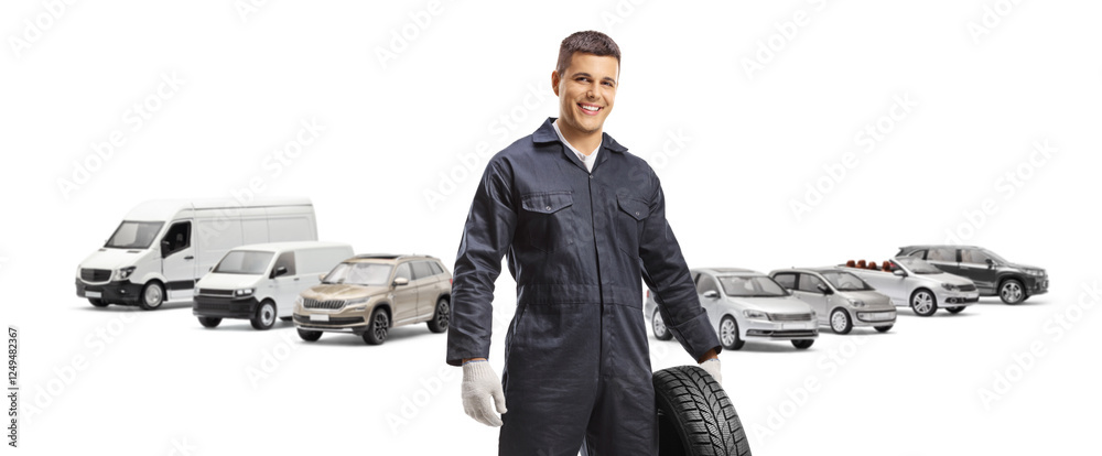 Smiling auto mechanic in a uniform holding a car tire at a car parking