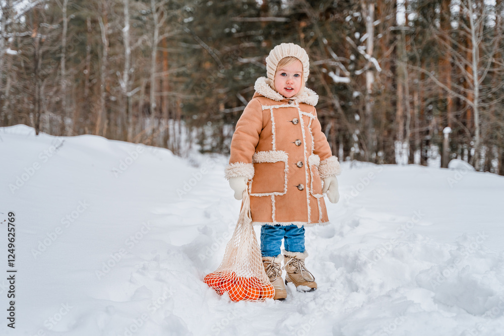 Child girl in a beige coat or in winter sheepskin coats and hats in a snowy forest. A three-year-old girl has fun in winter. Kid in winter Russian folk clothes, like in a fairy tale. One person