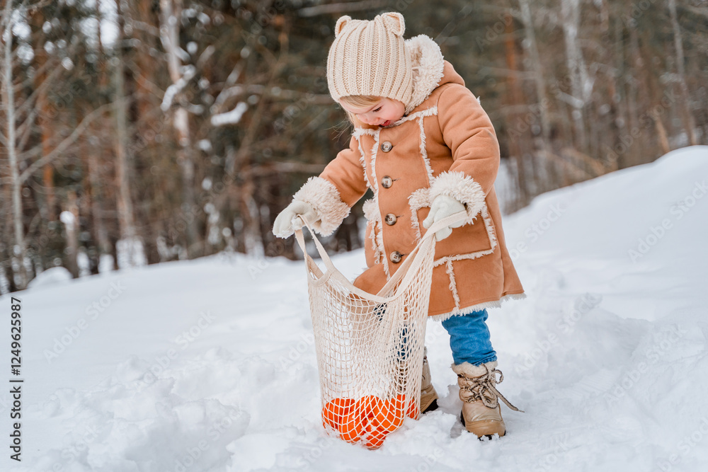 Child girl in a beige coat or in winter sheepskin coats and hats in a snowy forest. A three-year-old girl has fun in winter. Kid in winter Russian folk clothes, like in a fairy tale. One person