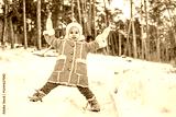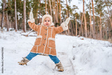 Child girl in a beige coat or in winter sheepskin coats and hats in a snowy forest. A three-year-old girl has fun in winter. Kid in winter Russian folk clothes, like in a fairy tale. One person