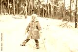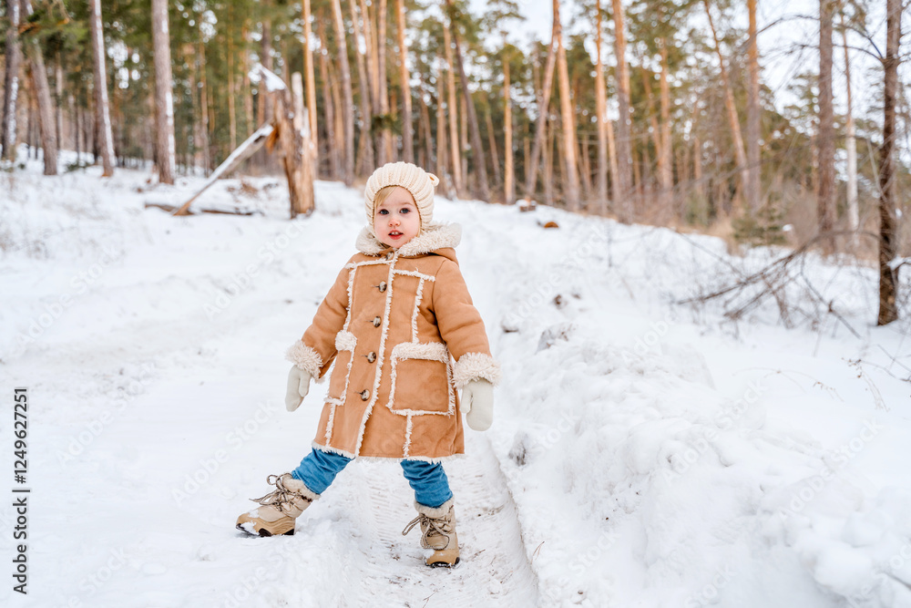 Child girl in a beige coat or in winter sheepskin coats and hats in a snowy forest. A three-year-old girl has fun in winter. Kid in winter Russian folk clothes, like in a fairy tale. One person