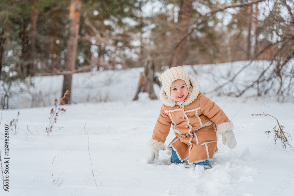 Child girl in a beige coat or in winter sheepskin coats and hats in a snowy forest. A three-year-old girl has fun in winter. Kid in winter Russian folk clothes, like in a fairy tale. One person