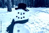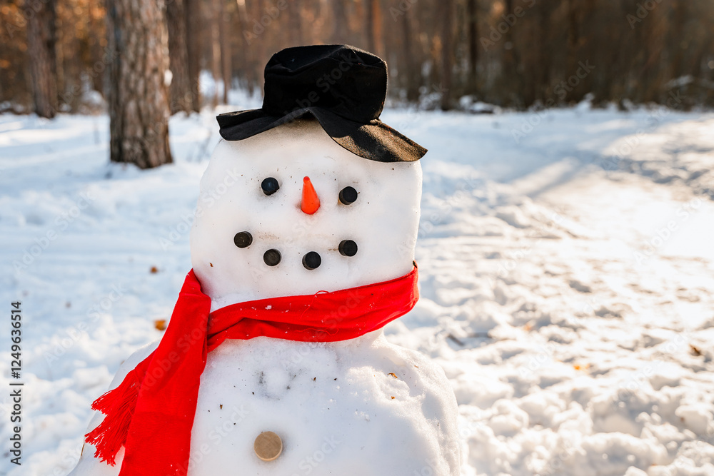 A snowy forest landscape with a snowman with a carrot in winter. The concept of winter entertainment for the whole family, a beautiful postcard of winter months and vacations.