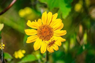 Ochraethes tulensis, ochre long-horned beetle on a thin-leaved sunflower, in the Sierra de Guadalupe, Mexico State