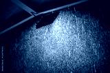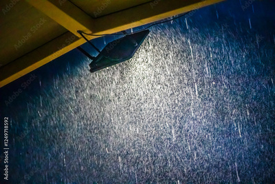 Rain falling in front of a lamp, with a dark blue cloudy background, and a yellow roof, colors of the starry night