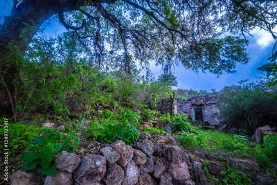 Old house in ruins at sunset framed by a tree, in Rancho Los Cardos in Monte Escobedo, Zacatecas