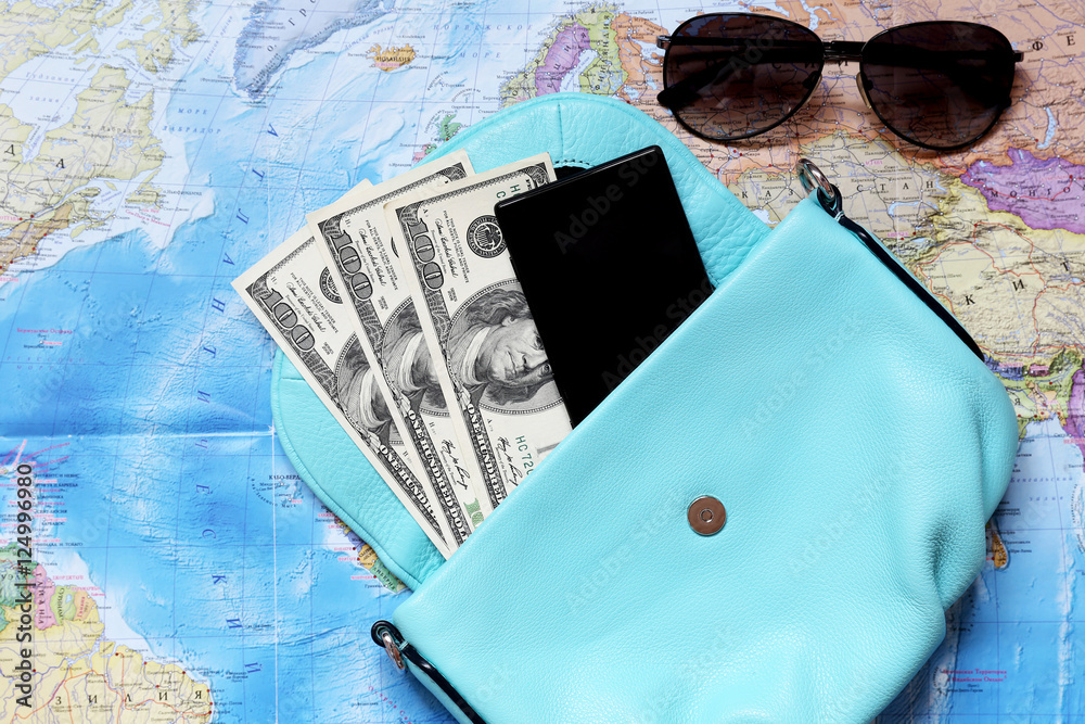 Some staff for travel. Money, glasses, bag, phone, coins are located on the intrenational map.