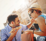 Couple eating pizza outdoors and smiling