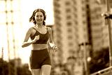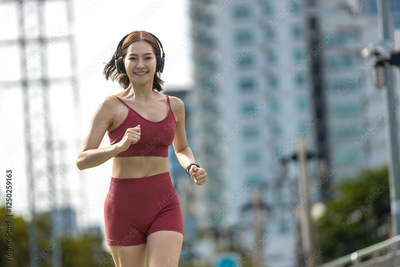 Young beautiful woman sportswear workout clothes exercise running street city park before morning run. Asian strong female sporty sportswear jogging outdoors. fitness healthy concept.