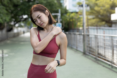 women red sportswear standing problem neck, shoulder and back painful after exercise. female bone injuries pain. discomfort sprain orthopedic.